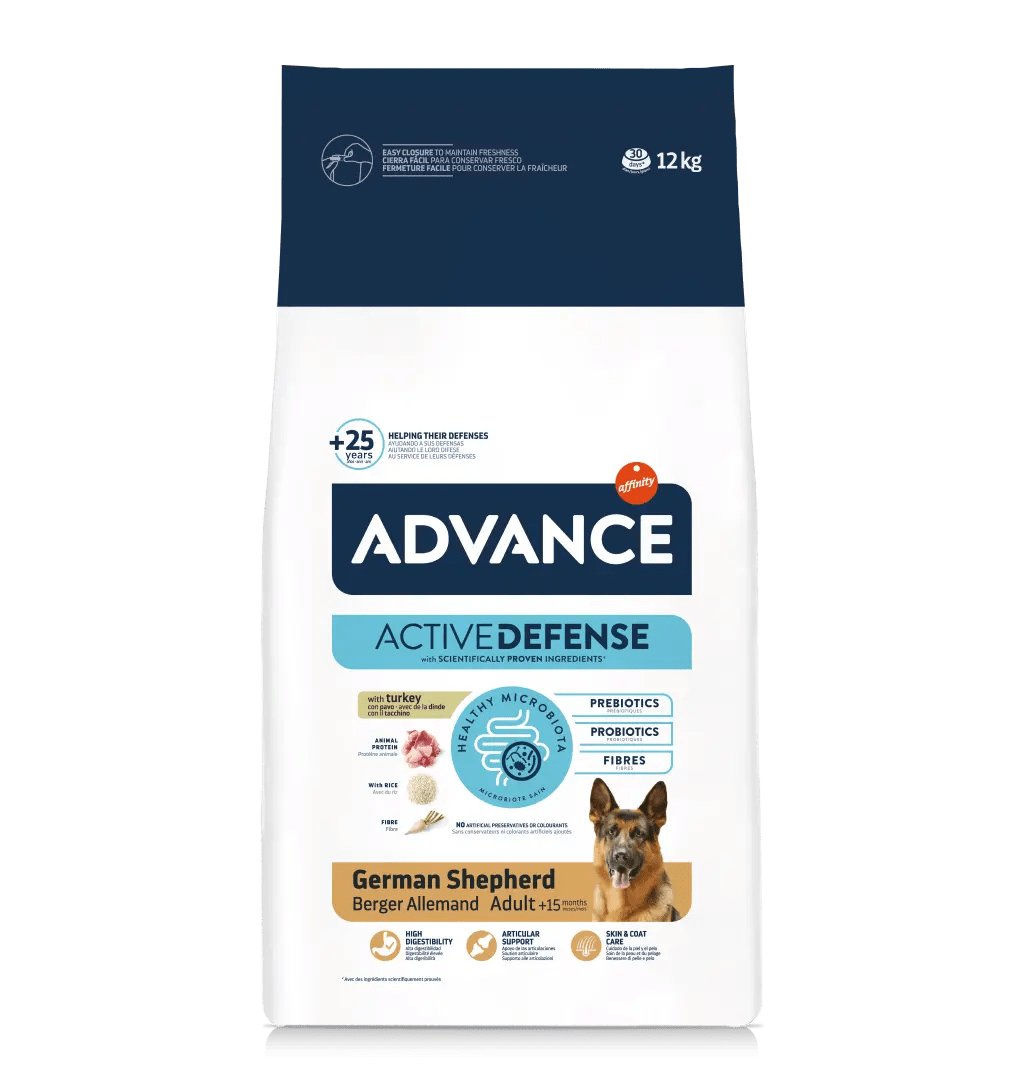 Pastor Alemán adultos a partir de 15 meses. Está formulado específicamente para el cuidado de los perros de la raza Pastor Alemán. Está elaborado con aceite de coco, pollo, pavo y arroz, ingredientes altamente digestibles. Contiene condroitina y glucosamina que ayudan a mantener el cartílago articular. Además, contribuye a una piel saludable y un pelo brillante gracias a los ácidos grasos omega 6 y 3, biotina y zinc.
